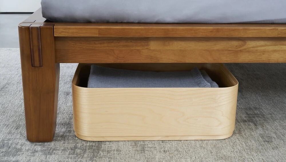 フレームの構造は、日本の伝統建築の「組木」からインスパイアされています。木材同士がお互いを支え合いながら揺れや圧力を受け流すことでとても安定した強度を保ちます。また、金属をほぼ使っていないため、劣化しにくいというメリットも。もし劣化や破損があってもパーツのみの交換が可能です。まさに「いいものを長く使う」ための職人の知恵と技術がつまった、サステナブルなベッドフレーム。ぜひ愛着を持って長く使ってあげてください。